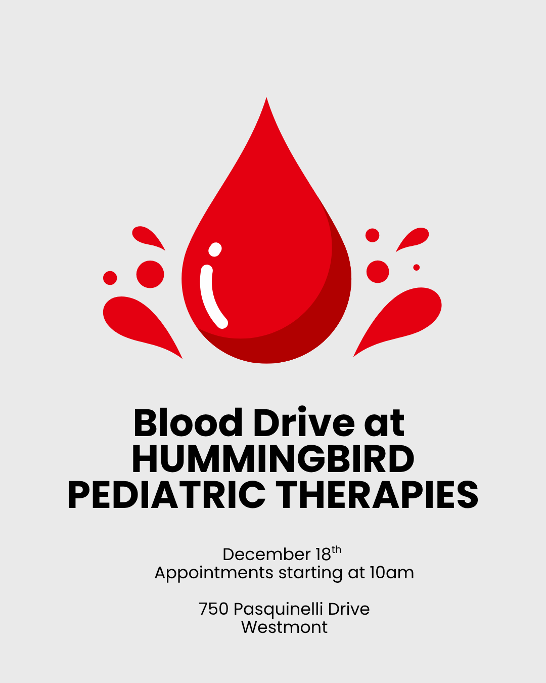 Join Hummingbird Pediatric Therapies’ Blood Drive! You’re invited to donate and become a hero for those in our local community requiring blood at our upcoming blood drive. Your single donation can help as many as three neighbors needing blood.